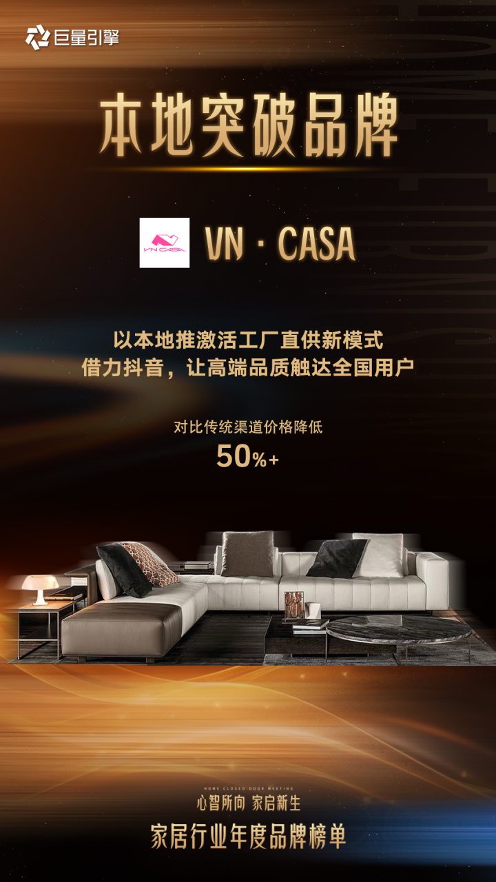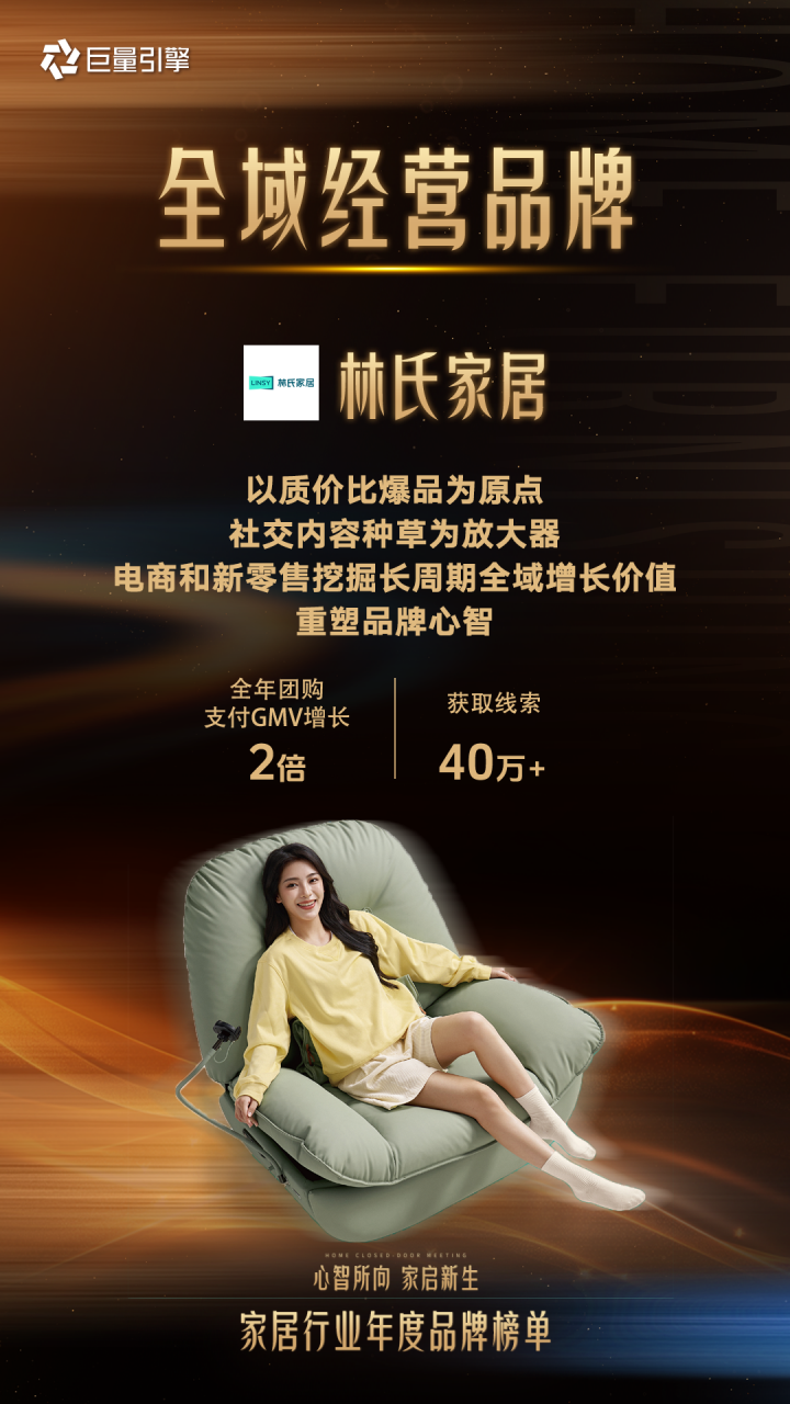 为了系统梳理这些宝贵实践,分享可复制的经验,巨量引擎正式发布「家居行业年度品牌榜单」,通过真实生意数据拆解、行业创新引领案例等维度遴选出“行业领航品牌、营销卓越品牌、全域经营品牌、生态破局品牌、种草浪潮品牌、心智共振品牌、本地突破品牌”七大类型年度品牌,系统呈现40家品牌的差异化打法,为行业提供了可借鉴的增长风向与标杆示例。