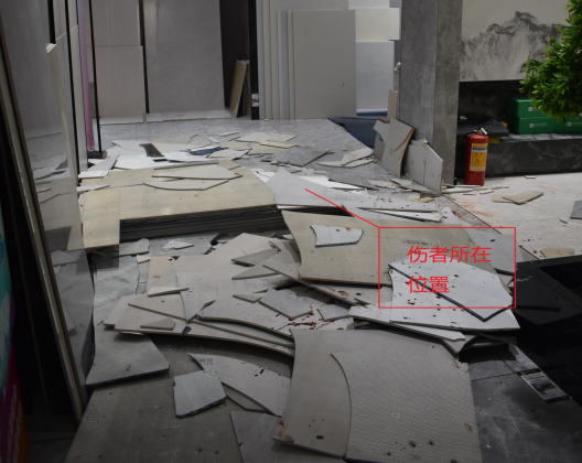 据案件情况介绍,涉事瓷砖堆为下架产品,数量大约20块,事发前被斜靠摆放在展示墙旁。事故当天,店主与事故伤者、货运司机在搬运所需瓷砖时,由一人扶着最外面的瓷砖,其余两人从后面将瓷砖立起来,把所需瓷砖抽出来。搬运过程中,瓷砖总体重量超出伤者的支撑承力,倾倒后将其压伤。经测量,瓷砖尺寸为180CM*90CM*1CM,单块重约40KG,压在伤者身上的瓷砖共约400KG。现场可见瓷砖碎片散落一地,地面留有血迹,事故后送医经鉴定伤情达到重伤标准。