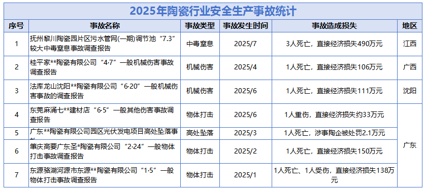 据统计,2025年广东、沈阳、江西等地共发生7起安全生产事故,其中包括中毒窒息、机械伤害、高处坠落、物体倒塌打击等,导致8名陶瓷人身亡、2人受伤,造成直接经济损失累计超1028万元。