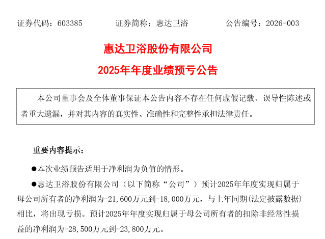 1月22日,惠达卫浴股份有限公司(简称“惠达卫浴”)发布2025年年度业绩预亏公告。根据公告披露的初步测算数据,公司预计2025年年度归属于母公司所有者的净利润亏损1.8亿元至2.16亿元。与上年同期归属于母公司所有者的净利润1.39亿元相比,业绩由盈转亏,同比变动显著。同时,公司预计2025年扣除非经常性损益后的净利润亏损2.38亿元至2.85亿元,亏损幅度更大。