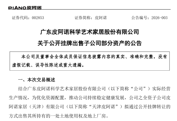 1月23日,皮阿诺发布公告,宣布将出售其位于天津的一处工业厂房及土地使用权,以优化资产配置。根据公告,公司全资子公司皮阿诺家居(天津)有限公司拟通过公开挂牌方式,转让其位于天津市静海经济开发区北区三号路21号的资产。