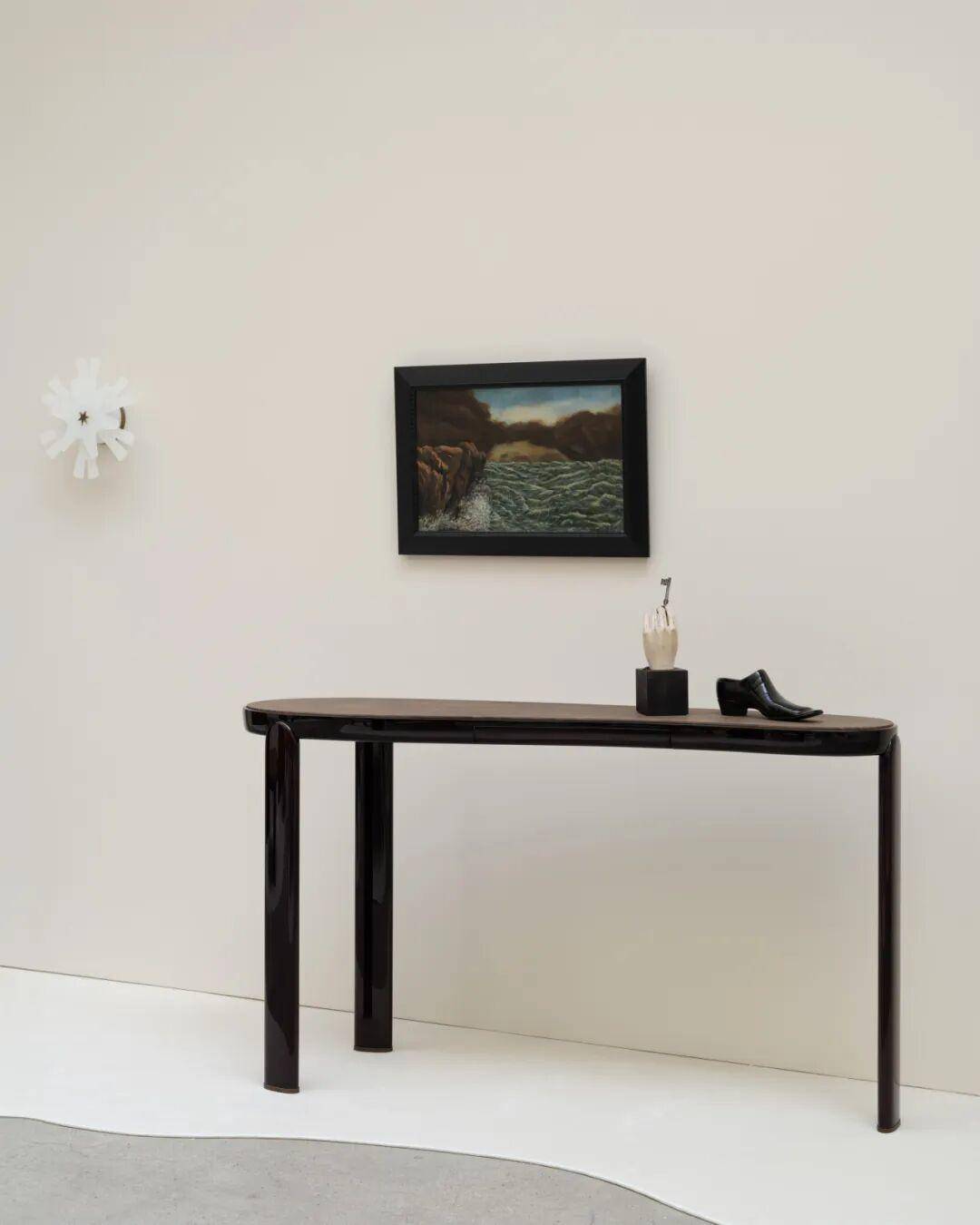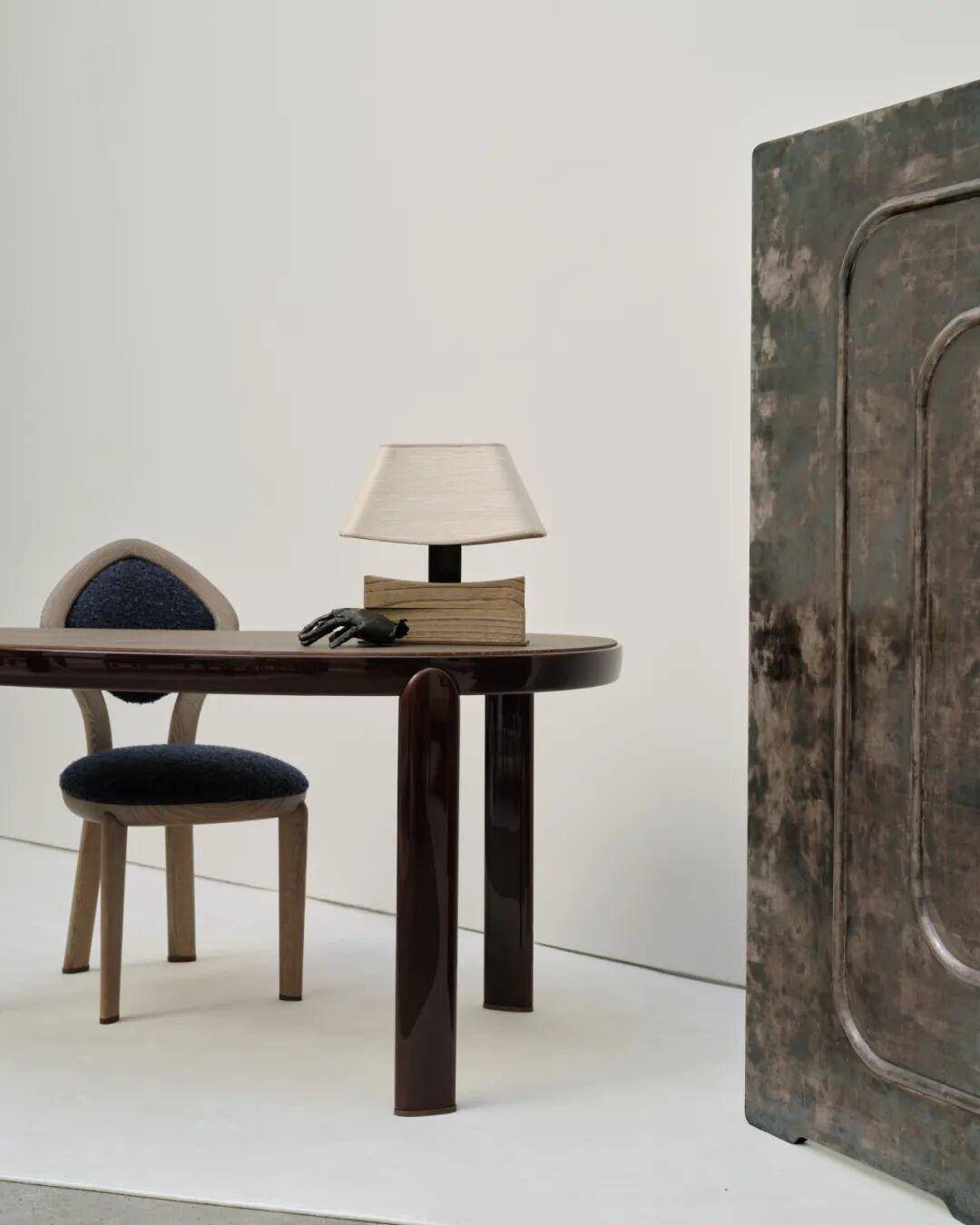 这一系列的创作灵感深植于约万诺维奇与已故时装大师皮尔·卡丹(Pierre Cardin)长达八年的合作经历,意在向卡丹工作室于1970年代推出的标志性“实用雕塑”系列致敬。系列作品在材质上构建了一场精妙的对话:主体结构选用天然或经过深色气磨处理的栗木,以凸显木材本身的温润质感与细腻纹理;而漆艺则被精心施用于家具的底座等关键部位,通过极致纯粹的线条与深邃的色彩,强化了每件作品作为现代雕塑的立体感与艺术表现力。漆色提供了蓝、棕、红、黑四种选择,为简约的形态注入深沉而富有情感的色彩维度。