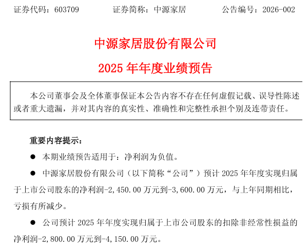 中源家居2025年预亏最高3600万元