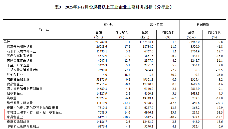 2025年家具制造业利润下降12.1%,木材加工业下降38.3%