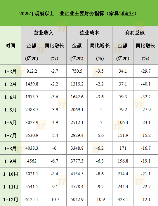 其中,家具制造业2025年营业收入6125.1亿元,同比下降10.7%;营业成本5042.9亿元,同比下降10.9%;利润总额为328.1亿元,同比下降12.1%。从全年各月累计数据来看,家具制造业的营收与利润同比降幅呈现波动中略有收窄的趋势,但直至年底,利润降幅仍超过两位数,显示出行业复苏面临挑战。