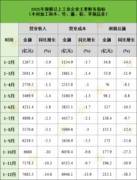 与之关联密切的木材加工和木、竹、藤、棕、草制品业,全年营收7683.3亿元,同比下降14.6%;营业成本6946.1亿元,同比下降13.9%;利润总额215.1亿元,同比大幅下降38.3%。木材加工业的利润下滑幅度远超家具制造业,且其降幅从下半年开始显著扩大,特别是在10月之后,利润同比降幅持续加深,反映出产业链上游面临的成本与需求压力更为严峻。