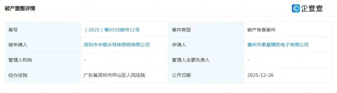 近日,据深圳市坪山区人民法院公开的破产申请文件信息,惠州市泰基精密电子有限公司(以下简称“泰基精密”)正式申请深圳市中顺半导体照明有限公司(以下简称“中顺半导体”)破产清算。