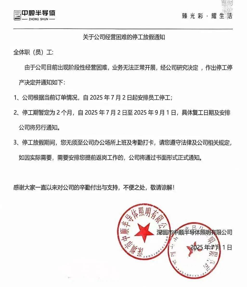 然而随后,因深陷经营危机,中顺半导体于2025年7月1日起宣布停工停产。据此前的《停工放假通知》,中顺半导体称,由于公司目前出现阶段性经营困难,业务无法正常开展,经公司研究决定,作出停工停产决定,停工期暂定为两个月,自2025年7月2日至2025年9月1日。