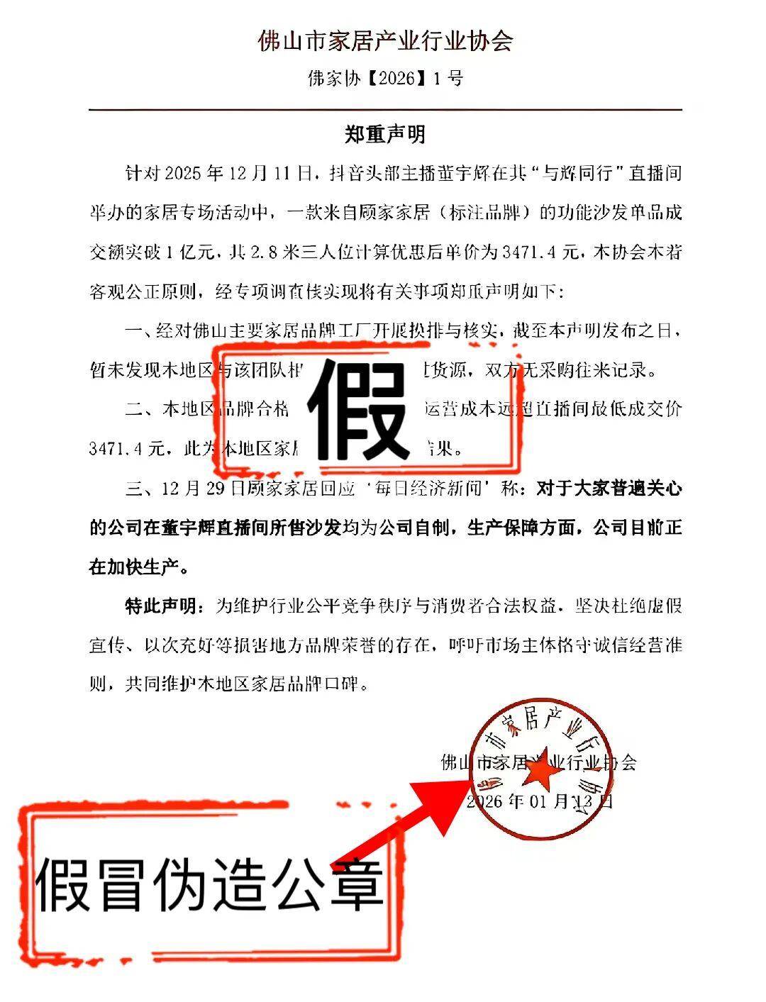 近期,一份以“佛山市家居产业行业协会”名义发布、落款日期为2026年1月13日的《郑重声明》,在网络上引起广泛关注。该声明直指知名主播“与辉同行”直播间一款声称出自顾家家居、售价3471.4元的功能沙发,经其调查,未发现佛山地区工厂为该直播专场供货的记录,并称该价格“远低于”当地品牌的正常运营成本。