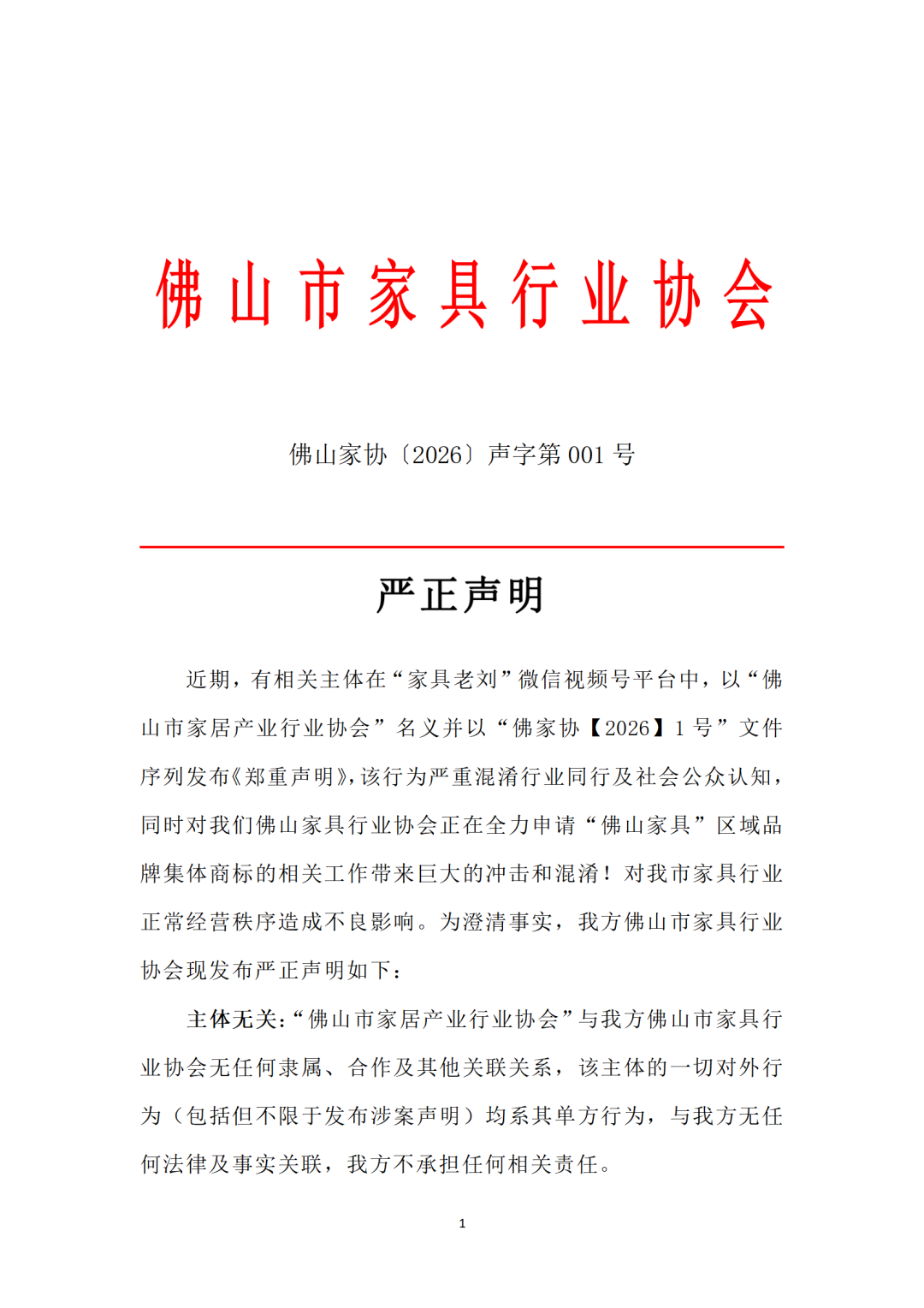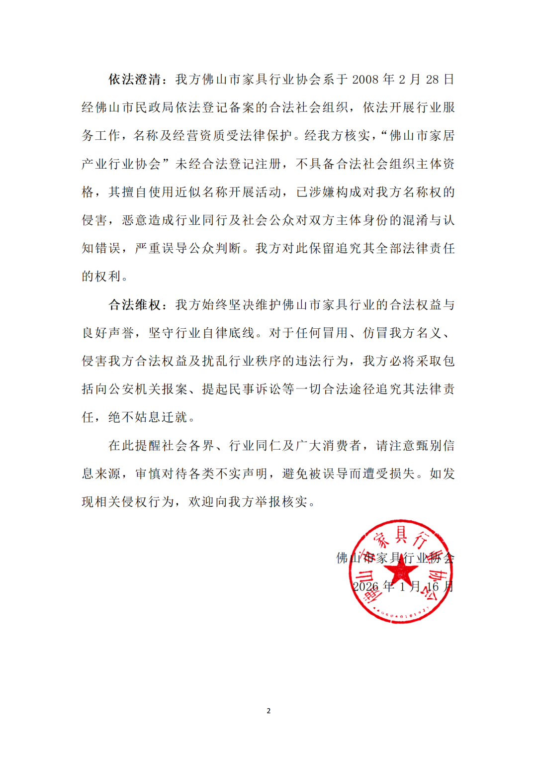 然而,此事很快出现了戏剧性反转。2026年1月16日,另一家登记备案已久的“佛山市家具行业协会”发布《严正声明》,明确指出此前发布声明的“佛山市家居产业行业协会”并非合法注册的社会组织,其名称涉嫌仿冒侵权,并强调与该组织无任何关联。