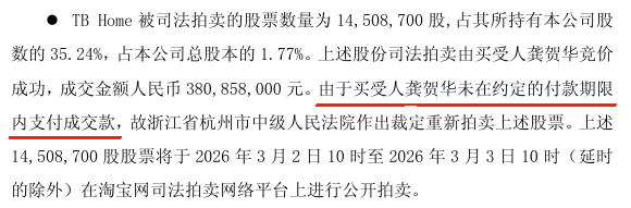 尽管股东层面股权状态复杂,公司公告强调,TB Home并非控股股东,其股份处置不会导致公司控制权发生变更,也不会对日常生产经营产生影响。然而,近3.8亿元规模的股权在短时间内经历流拍、悔拍再重拍,无疑为这部分资产的最终处置增添了不确定性,也引发了市场对相关股东自身状况的关注。