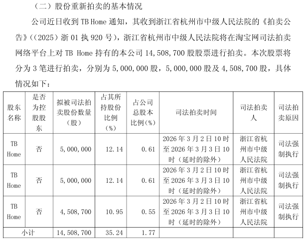 根据公司于1月28日晚间发布的公告,涉及约1450.87万股、价值高达3.8亿元的股份,将于2026年3月2日至3日期间在淘宝网司法拍卖平台重新进行公开拍卖,并分为三笔进行。这一变故源于首次拍卖的买受人龚贺华在成功竞价后,未能在约定期限内支付成交款项,导致浙江省杭州市中级人民法院裁定重新拍卖。