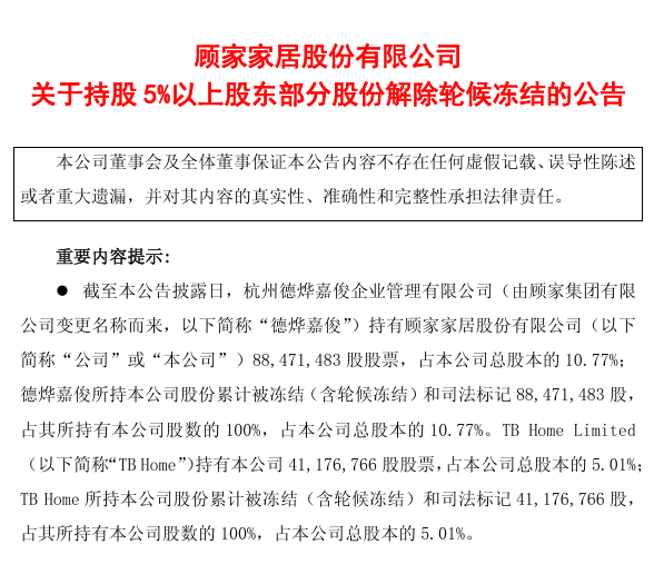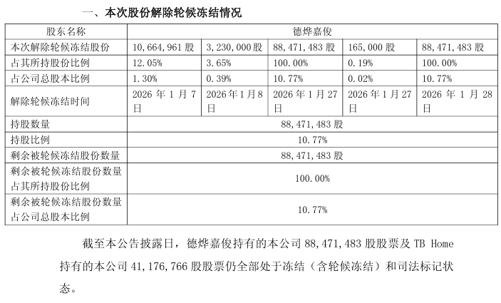 值得注意的是,在同日发布的另一份公告中,与TB Home为一致行动人的德烨嘉俊,其部分股份的轮候冻结状态得到了解除。根据公告,德烨嘉俊此前被浙江省杭州市中级人民法院、杭州市钱塘区人民法院及河北省衡水市中级人民法院轮候冻结的股份,已于2026年1月7日至28日期间陆续解除了轮候冻结。不过,解除轮候冻结并不意味着股份获得解冻,截至公告日,德烨嘉俊与TB Home所持有的全部公司股份仍处于冻结(含轮候冻结)和司法标记状态。