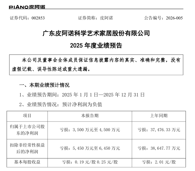 1月29日晚间,皮阿诺科学艺术家居股份有限公司(以下简称“皮阿诺”)发布2025年度业绩预告,数据显示其亏损幅度较上年同期出现显著收窄,但主营业务依然深陷困境。