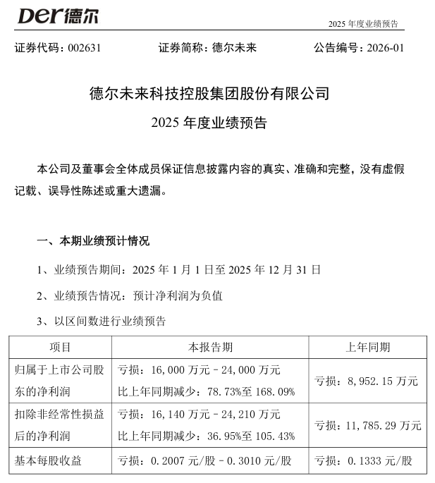 1月29日,德尔未来科技控股集团股份有限公司(以下简称“德尔未来”)发布2025年度业绩预告,公司预计2025年归属于上市公司股东的净利润为亏损1.6亿元至2.4亿元,相较于上年同期亏损8952.15万元,亏损幅度不仅未能收窄,反而可能大幅扩大78.73%至168.09%。扣除非经常性损益后的净利润预计亏损16,140万元至24,210万元,亏损同比亦显著扩大。这份预告揭示了这家家居企业在房地产行业深度调整周期中所承受的巨大压力。