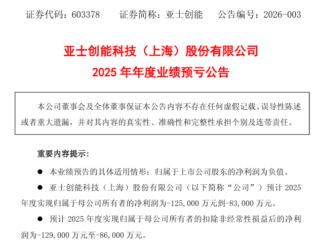1月30日,亚士创能科技(上海)股份有限公司(简称“亚士创能”)发布了2025年度业绩预亏公告。公告显示,公司预计2025年年度归属于母公司所有者的净利润为-12.5亿元至-8.3亿元,相较上年同期的亏损约3.29亿元,亏损幅度显著扩大。其扣除非经常性损益后的净利润预计为-12.9亿元至-8.6亿元,同样较上年同期的-3.58亿元亏损大幅增加。