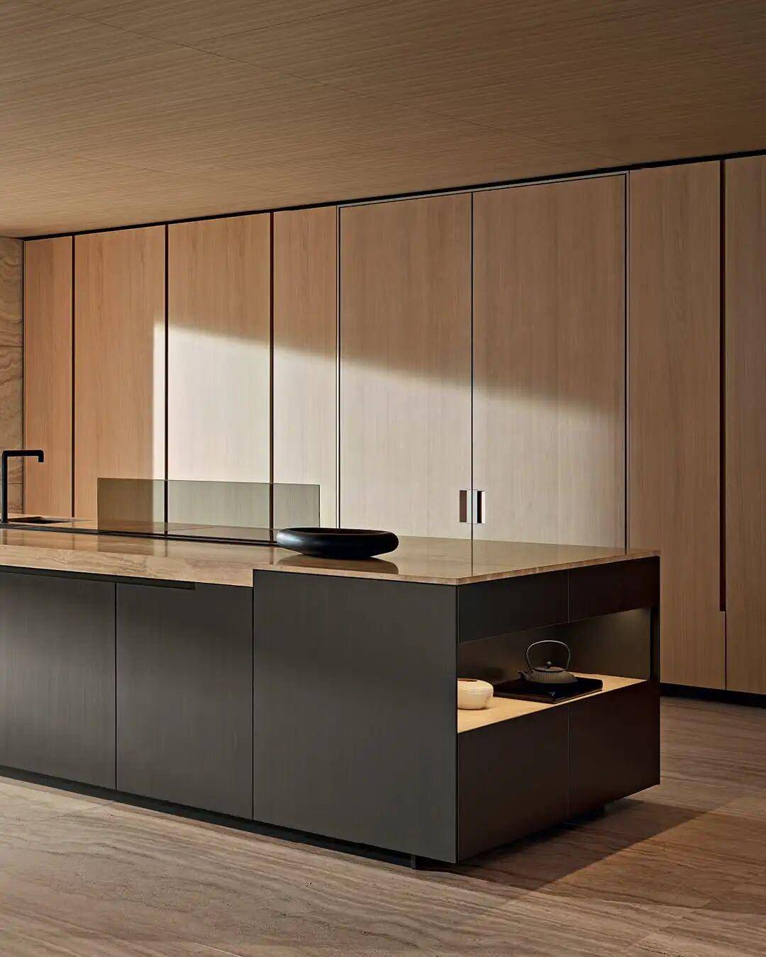 当第一缕晨光轻柔地拂过Phoenix系列的岩板台面,当深色柜体与温润的原生木饰面在自然光影中交织出丰富的肌理与层次,一种静谧而高级的空间叙事便悄然展开。这不仅是一套橱柜,更是一个理解现代生活方式的载体——它懂得厨房远不止是烹饪的场所,更应是情感流动的空间:是清晨为家人准备早餐时升腾的温暖烟火气,是周末与好友倚在岛台边举杯谈笑的轻松片刻,也是深夜独自享受备餐过程的那份安宁与自愈。