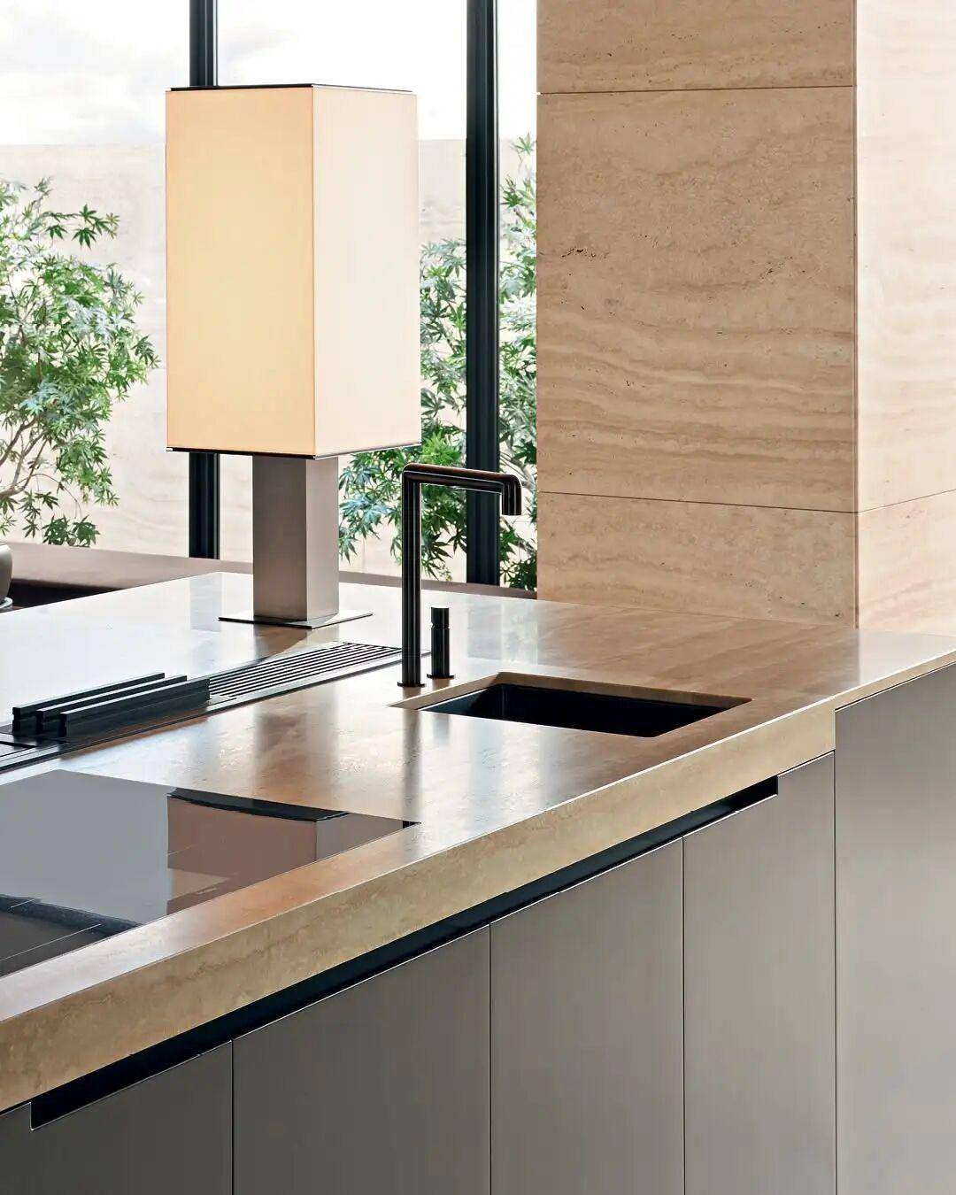 在功能上,Phoenix将极简美学贯彻至每一个细节:无拉手的悬浮式柜体营造出干净利落的视觉平面,将收纳空间隐于无形;内部则配备高效的系统解决方案,如内嵌式升降拉篮、科学分区的抽屉系统以及可隐藏的抽油烟机,确保所有厨具杂物都能井然有序,时刻维持台面的空无一物与极致整洁。