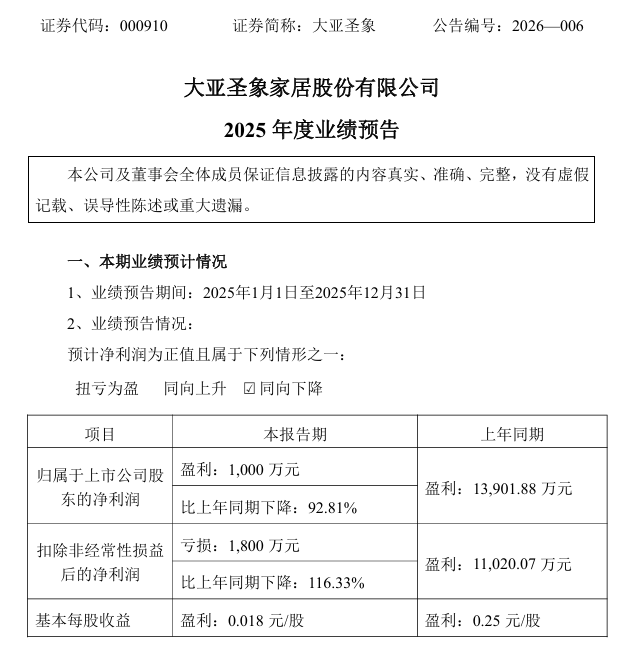1月31日,国内家居建材行业龙头企业大亚圣象家居股份有限公司(简称“大圣亚象”)发布了2025年度业绩预告,数据表现大幅低于市场预期。公告显示,公司预计2025年度实现归属于上市公司股东的净利润仅为1000万元,与上年同期的约1.39亿元相比,同比骤降92.81%。