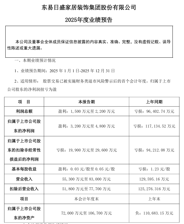 1月30日,处于退市风险警示状态的家装企业东易日盛发布2025年度业绩预告。公司预计2025年度实现扭亏为盈,归属于上市公司股东的净利润在3200万元至4800万元之间,相比上年同期巨亏约11.71亿元,业绩实现大幅逆转。