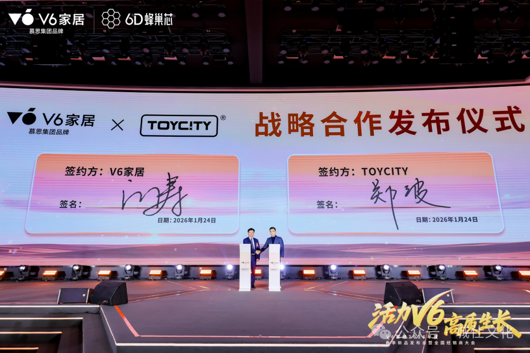 1月24日,中国原创潮玩品牌TOYCITY(玩具城市)与慕思集团旗下时尚家居品牌V6家居在东莞慕思新工业园正式签署战略合作协议。TOYCITY创始人兼总经理郑波与慕思集团V6家居事业部总经理江涛作为双方代表完成签约,标志着"潮玩文化"与"家居产业"跨界融合迈入实质性阶段。