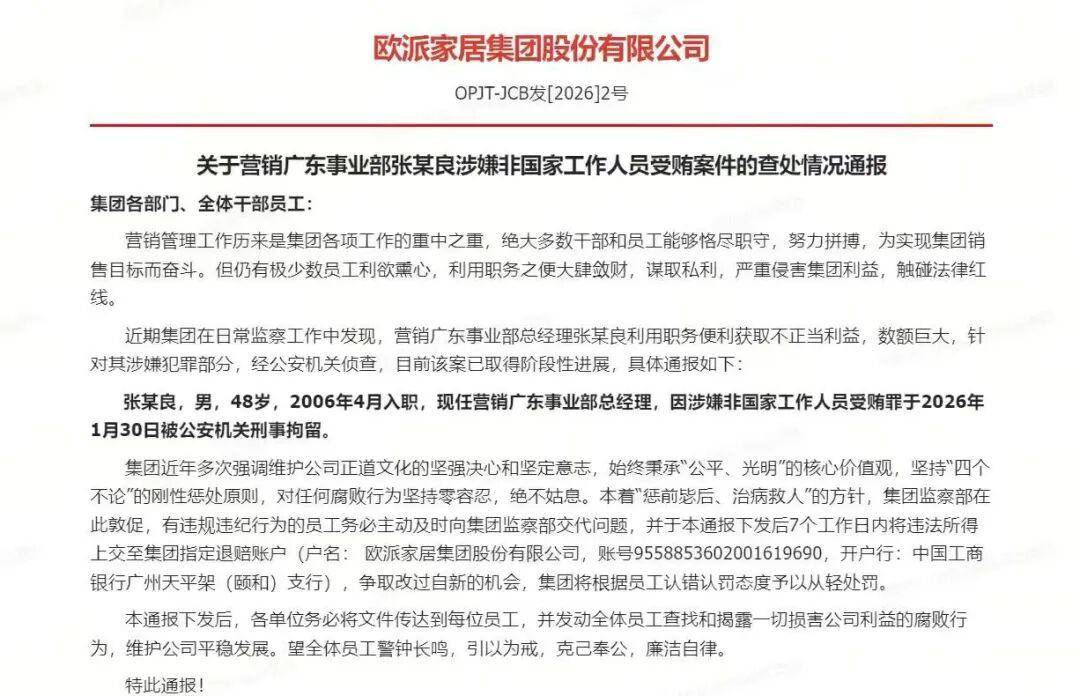 近日,欧派家居集团向集团各部门及全体干部员工发布内部通报,披露其营销广东事业部总经理张某良因涉嫌非国家工作人员受贿罪,已于2026年1月30日被公安机关刑事拘留。通报指出,该案系集团在日常监察工作中发现,经公安机关侦查后取得阶段性进展,涉案金额巨大。