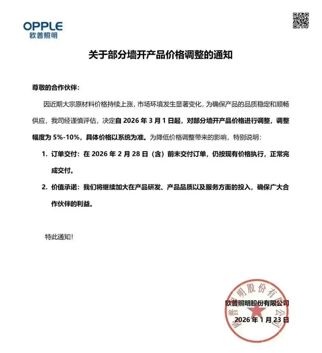 1月23日,欧普照明股份有限公司发布《关于部分墙开产品价格调整的通知》,其表示,因近期大宗原材料价格持续上涨,市场环境发生显著变化。为确保产品的品质稳定和顺畅供应,经公司谨慎评估,决定自3月1日起,对部分墙开产品价格进行调整,调整幅度为5%—10%。