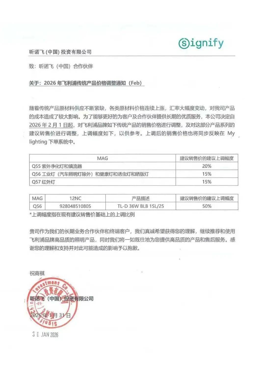 1月31日,昕诺飞(中国)投资有限公司更是连发两份价格调整通知。据《2026年飞利浦传统产品价格调整通知(Feb)》显示,自2月1日起,昕诺飞将对飞利浦品牌旗下Q55紫外净化灯和镇流器价格上调20%;对Q56工业灯(汽车照明灯除外)与健康灯、诱虫灯、晒版灯,以及Q57红外灯的价格上调15%。