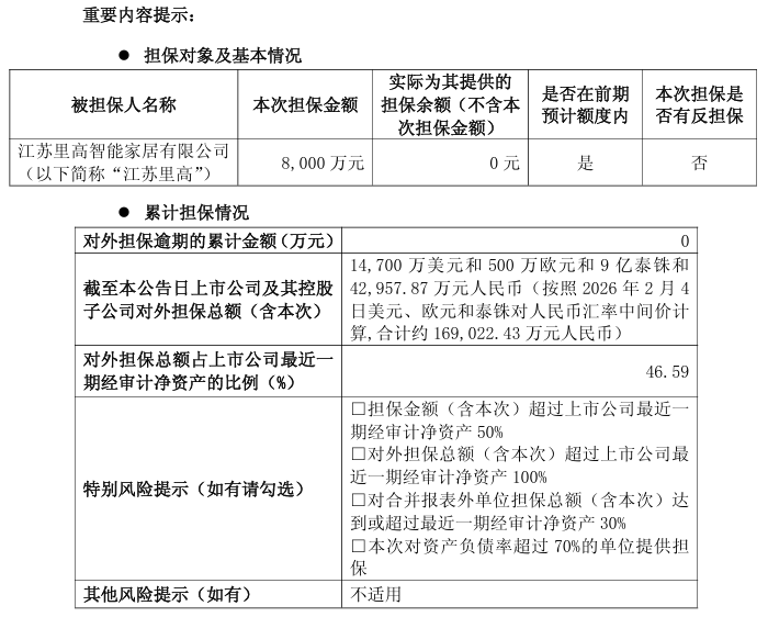 本次担保系在梦百合2025年度为江苏里高预留的3亿元担保额度内执行。担保前,公司对该子公司的担保余额为零;担保后,江苏里高剩余可用担保额度为2.2亿元。截至公告披露日,梦百合及其控股子公司对外担保总额(含已批准未使用额度)按当日汇率折算约合人民币36.95亿元,占公司最近一期经审计净资产的比例为101.85%。公司强调,所有对外担保均为对合并报表范围内子公司提供,且目前无逾期担保情形。