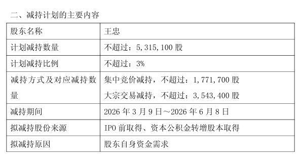 2月4日,江山欧派门业股份有限公司(简称“江山欧派”)发布公告,公司持股5%以上股东王忠计划在未来三个月内减持不超过531.51万股公司股份,约占公司总股本的3%。按照公司股票最新收盘价15.14元计算,此次减持股份对应市值约为8047.06万元。公告显示,王忠此次减持原因为“自身资金需求”,计划通过集中竞价与大宗交易相结合的方式进行,其中竞价交易减持不超过177.17万股(占总股本1%),大宗交易减持不超过354.34万股(占总股本2%)。减持期间为2026年3月9日至6月8日。