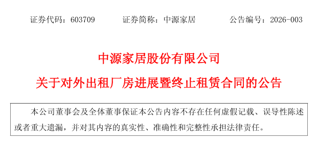 2月4日,中源家居股份有限公司(以下简称“中源家居”)发布公告,宣布其全资子公司浙江泽川家具制造有限公司与安吉铭创家具有限公司提前终止厂房租赁合同。根据公告,双方已于2026年2月4日签订《合同终止协议》,原定于2026年8月4日到期的租赁关系提前至2026年2月5日终止。