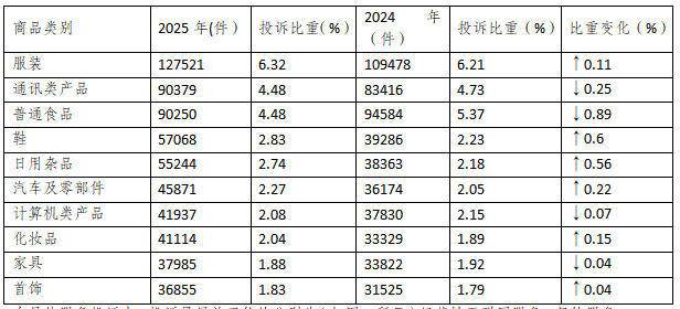 在所有投诉中,商品类投诉1081511件,占比53.63%,较2024年上升4.4个百分点;服务类投诉845710件,占比41.94%,下降0.27个百分点;其他类投诉89227件,占比4.42%。