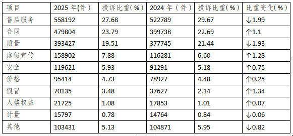 从投诉性质看,售后服务问题占比27.68%,合同问题占比23.79%,质量问题占比19.51%,虚假宣传问题占比7.88%,安全问题占比5.93%,价格问题占比4.73%,假冒问题占比3.48%,人格权益问题占比1.08%,计量问题占比0.78%,其他问题占比5.13%。与2024年相比,假冒、虚假宣传、合同问题投诉比重上升,售后服务、质量、其他问题投诉比重下降。