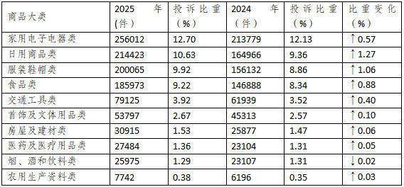 商品大类投诉中,家用电子电器类、房屋及建材类投诉量均进入所属投诉类别的前十位。其中,家用电子电器类投诉量居首位,达256012件,投诉比重为12.7%,与2024年同期相比投诉比重上升0.57%。房屋及建材类投诉量居第七位,为30915件,投诉比重为1.53%,与2024年同期相比上升0.06%。