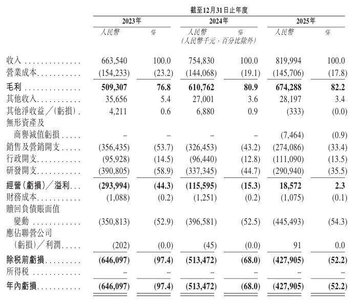 从财务数据来看,群核科技近年来保持持续增长。公司收入由2023年的6.64亿元增加13.8%至2024年的7.55亿元,2025年收入进一步增加8.6%,达到8.2亿元。毛利率表现尤为亮眼,2023年、2024年及2025年分别为76.8%、80.9%及82.2%,呈现稳步提升态势。在盈利能力方面,公司年内亏损由2023年的6.46亿元减少20.5%至2024年的5.14亿元,2025年亏损4.28亿元,进一步减少16.7%。经调整净亏损由2023年的2.42亿元大幅减少71.0%至2024年的7000万元,而2025年公司更是录得经调整净利润5710万元,实现扭亏为盈的关键突破。