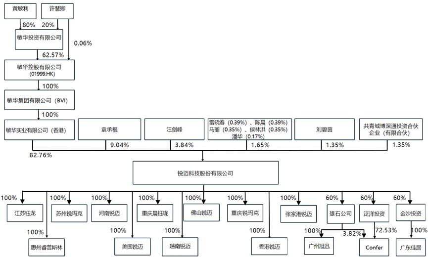 辅导备案报告显示,截至2026年2月12日,敏华实业直接持有锐迈科技82.76%的股权,为公司控股股东。敏华集团持有敏华实业100%股权,敏华控股持有敏华集团100%股权,敏华投资持有敏华控股62.57%股权。香港知名企业家黄敏利通过敏华投资、敏华控股、敏华集团及敏华实业合计间接控制公司82.76%股份,为公司的实际控制人。