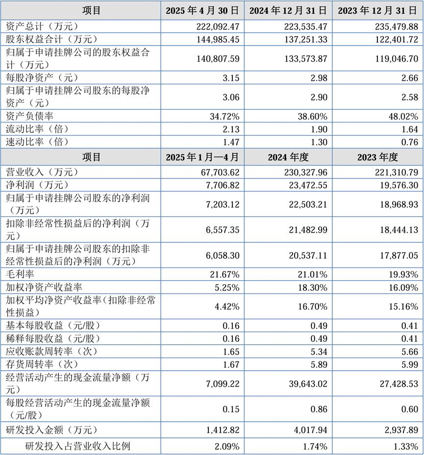 从财务数据来看,锐迈科技近年来保持稳健增长。2023年度、2024年度及2025年1至4月,公司营业收入分别为22.13亿元、23.03亿元和6.77亿元;净利润分别为1.96亿元、2.35亿元和7706.82万元;扣非净利润分别为1.84亿元、2.15亿元和6557.35万元。报告期各期,公司毛利率分别为19.93%、21.01%以及21.67%,呈现稳步提升态势。