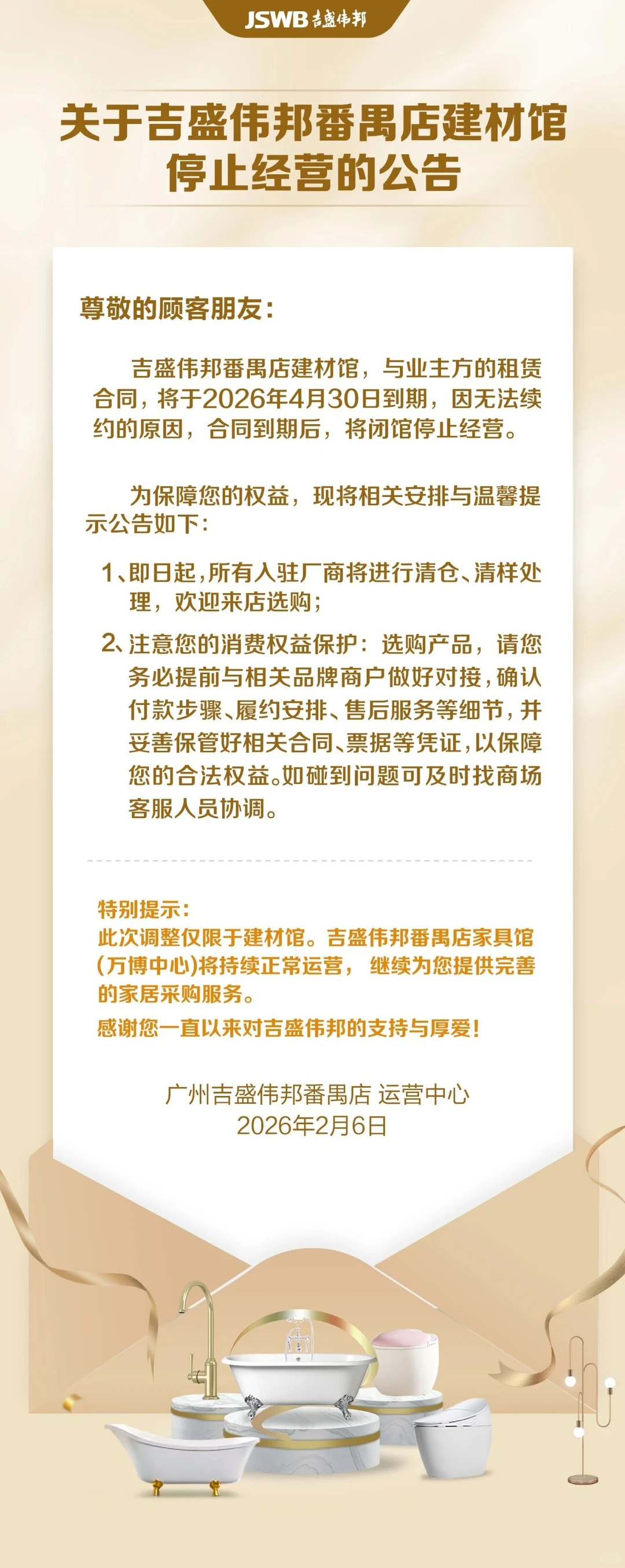 因与业主方的租赁合同将到期且无法续约,吉盛伟邦番禺建材馆将正式停止经营,即日起全场启动清仓清样。