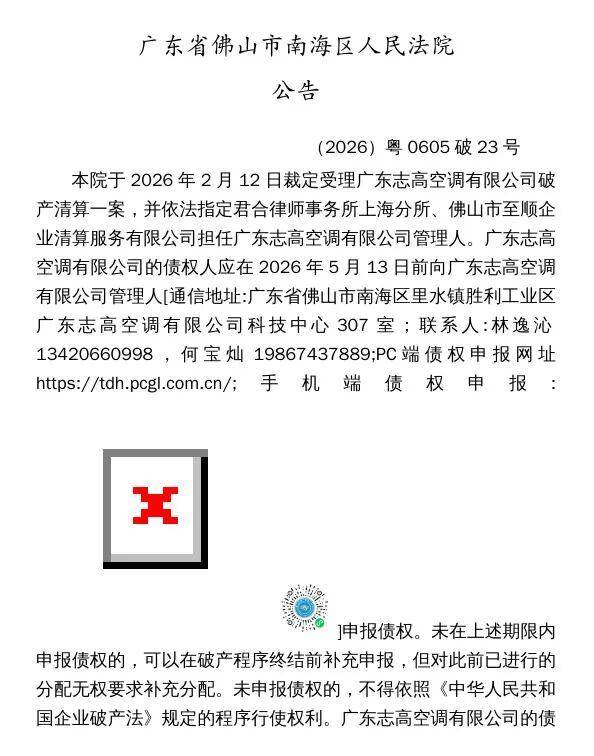 2026年春节前夕,一则公告让沉寂多年的志高空调重回公众视野。2月13日晚间,全国企业破产重整案件信息网披露,佛山市南海区人民法院于2月12日裁定受理广东志高空调有限公司破产清算申请。这家曾与格力、美的、海尔并称国内空调“四小龙”的老牌企业,正式进入破产清算程序。