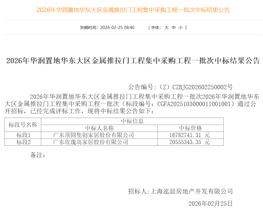 2月25日,华润置地华东大区发布2026年度金属推拉门工程集中采购一批次中标结果公告。根据公告,广东顶固集创家居股份有限公司与广东玫瑰岛家居股份有限公司分别中标该项目两个标段,中标金额合计逾3700万元。
