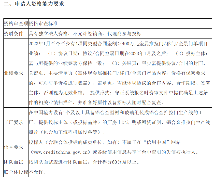 根据项目此前的资格预审公告,本次集采对投标企业设置了较高的准入门槛。资质方面明确要求投标人须为独立法人,且不接受经销商、代理商参与。业绩方面要求2023年1月至今至少有4项同类型合同金额超400万元的金属推拉门/移门/全景门项目业绩。此外,投标企业还需在中国境内设有具备铝合金型材和玻璃组装成铝合金推拉门生产线的工厂,并提供相关证明。团队面试合格线设定为60分及以上,且不允许联合体投标。