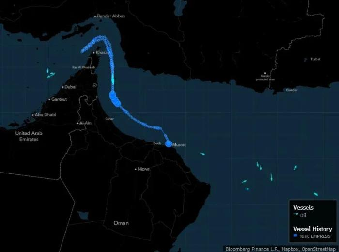 2月28日,KHK Empress号油轮在霍尔木兹海峡掉头,而其他船只则在水道外等待。