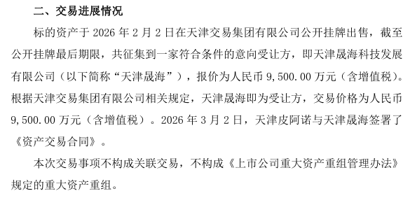 根据公告,标的资产于2026年2月2日在天津交易集团有限公司公开挂牌出售,截至公开挂牌最后期限,共征集到一家符合条件的意向受让方,即天津晟海,报价为9500万元。2026年3月2日,天津皮阿诺与天津晟海正式签署《资产交易合同》。