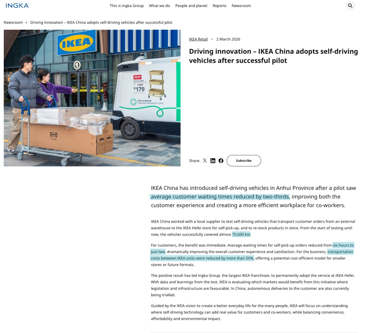引入无人配送带来的改变立竿见影。据英格卡集团数据,消费者端购物体验与满意度显著提升,自提订单平均等待时间从6小时压缩至2小时,缩短三分之二;企业运营端,宜家各运营单元间运输成本降低超50%,为小型门店拓展及新业态探索提供了高性价比运营模式。