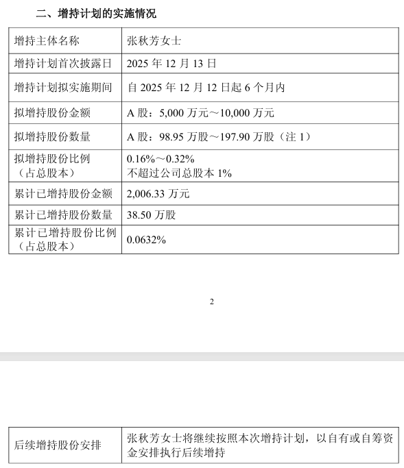 按照增持计划下限5000万元计算,目前已完成增持金额的40.13%;按上限1亿元计算,已完成约20.06%。公告显示,本次增持计划尚未实施完毕,张秋芳将继续按照计划以自有或自筹资金执行后续增持。