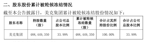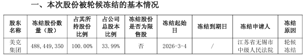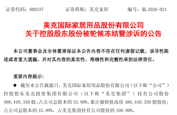 3月5日晚间,美克家居发布公告,公司控股股东美克投资集团有限公司所持4.88亿股股份被全部轮候冻结,占公司总股本的33.99%,占美克集团持股的100%。冻结起始日为2026年3月4日,执行方为江苏省无锡市中级人民法院。