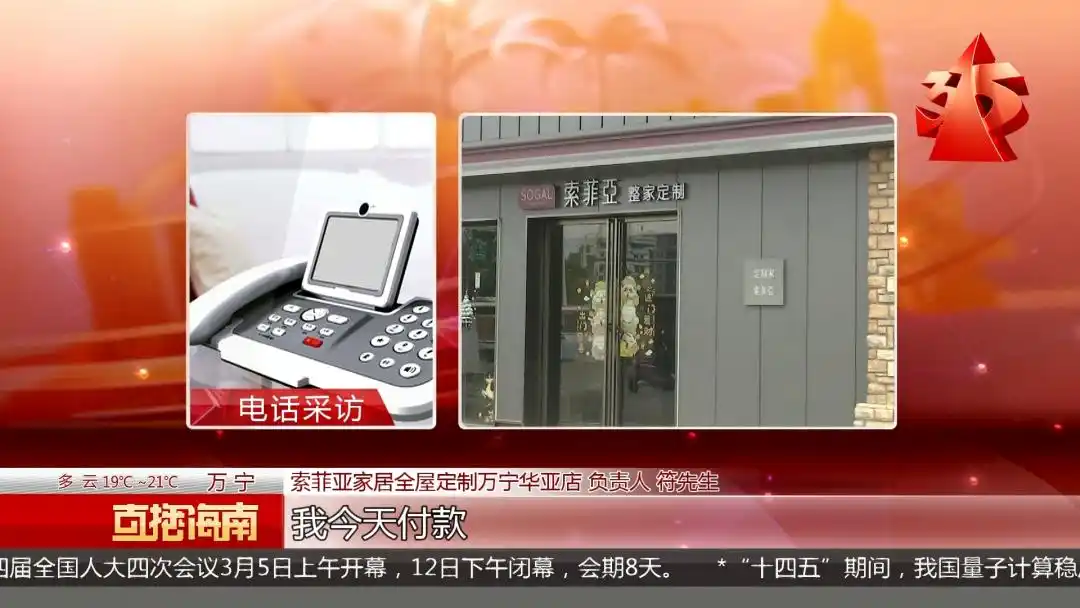 索菲亚家居全屋定制万宁华亚店负责人符先生:(记者:为啥关门啊?那个店关门?)嗯,过完(正月)十五就正常开工回来了。(记者:当初为什么不排单,不下单呢拖到现在?)也是刚处理好店面,人员,那些出现了一些问题。(记者:你这边的话承诺曾女士家这个定制大概,多久可以做好?)今天下单的话得到差不多20号这样就可以回货。(记者:总部说下单你还要付款,你还没有付款。)对,我知道,我今天付款。