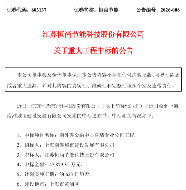 3月6日,江苏恒尚节能科技股份有限公司(简称“恒尚节能”)发布公告,公司于近日收到上海南滩城市建设发展有限公司发来的中标通知书,成功中标上海南外滩金融中心幕墙专业分包工程。项目中标金额为4.79亿元,约占公司2024年营业收入的22.17%。