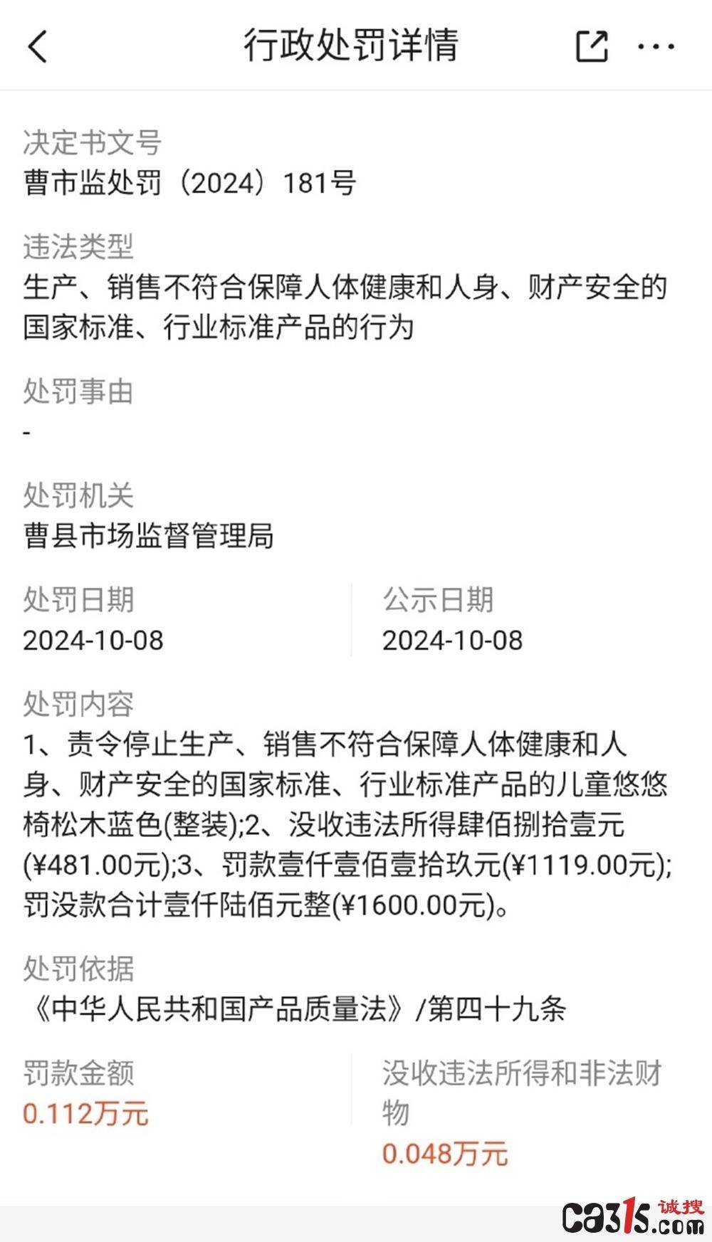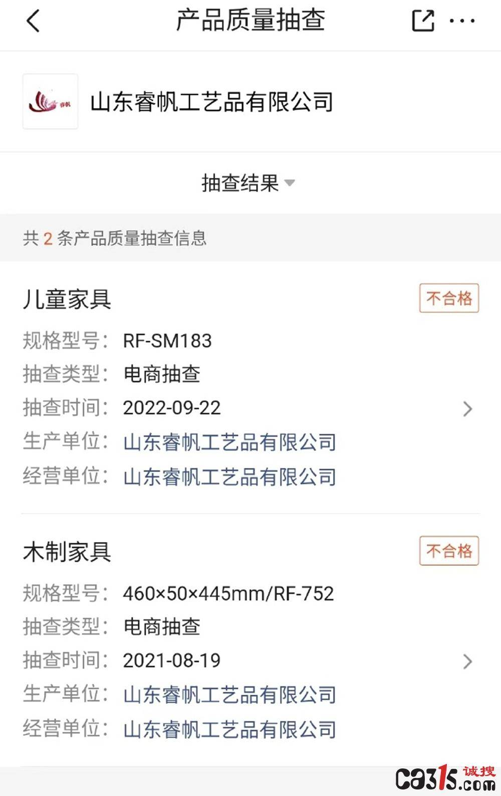 2021年8月19日,木制家具抽查不合格;2022年9月22日,儿童家具抽查不合格;2023年4月21日,山东曹县市场监督管理局因质量问题对其予以行政处罚(《曹市监处罚(2023)00165号》);2024年10月8日,曹县市场监督管理局再次以“生产、销售不符合保障人体健康和人身、财产安全的国家标准、行业标准产品的行为”对其进行处罚(《曹市监处罚(2024)181号》)。
