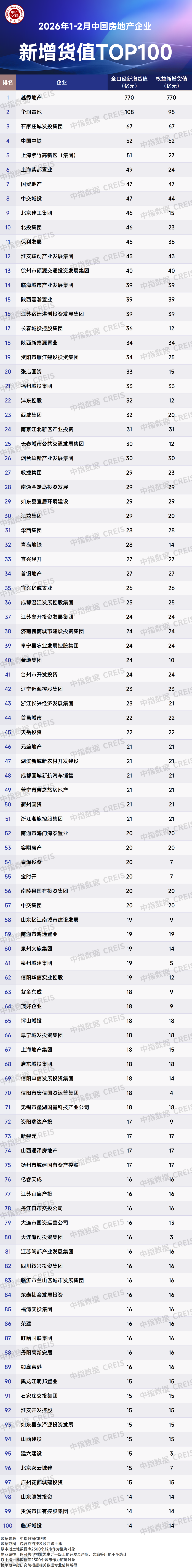 从新增货值来看,越秀地产、华润置地、石家庄城发投集团位列前三。2026年1-2月,越秀地产以770亿元新增货值位列第一,华润置地新增货值规模为108亿元,位列第二,石家庄城发投集团新增货值规模为67亿元,位列第三。TOP10企业2026年1-2月新增货值总额1282亿元,占TOP100企业的38.9%,新增货值门槛为14亿元。